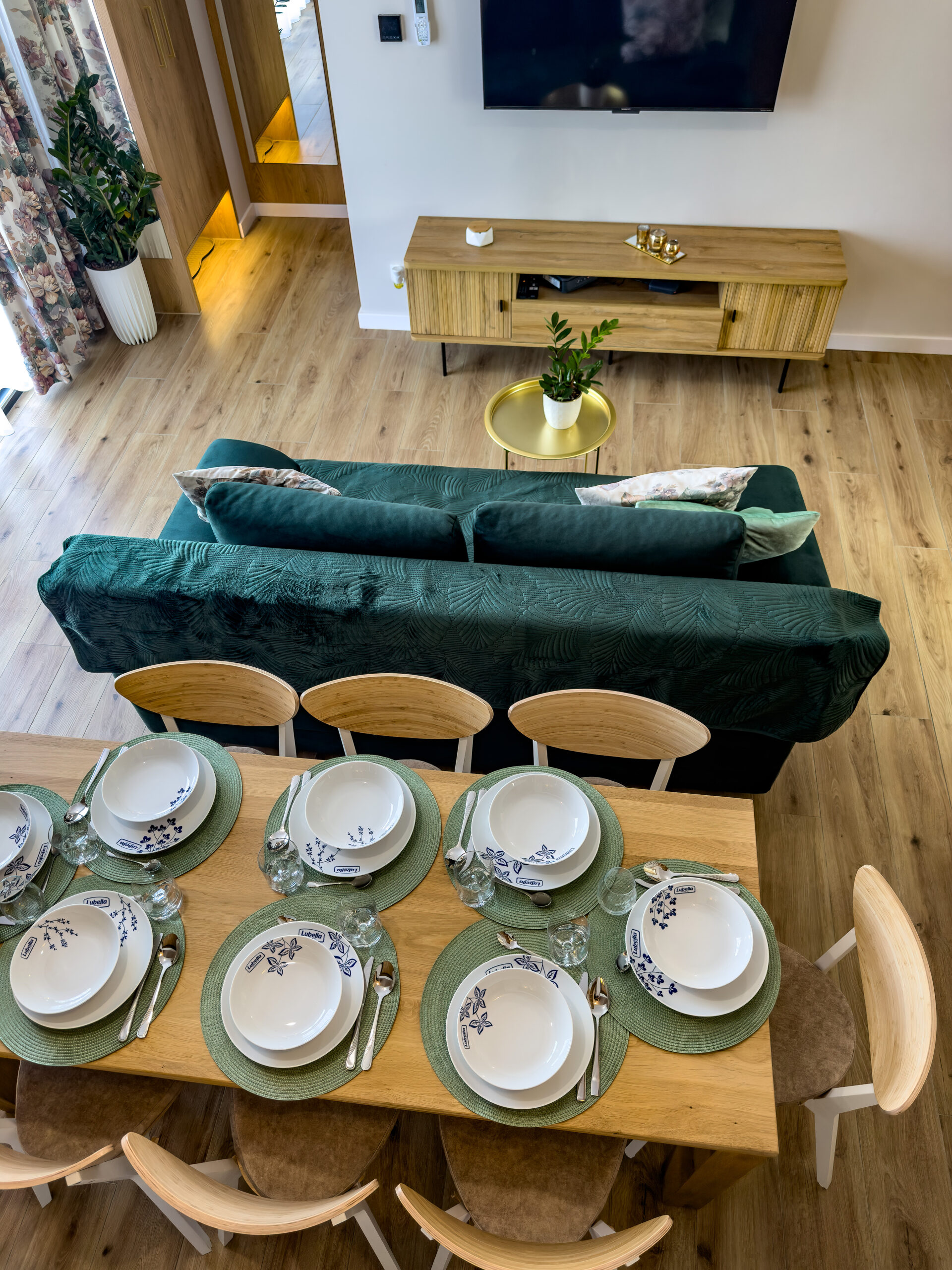 W wyposażeniu: płyta indukcyjna, piekarnik, lodówka z zamrażarką, zmywarka, ekspres do kawy Dolce Gusto, czajnik, naczynia, zastawa i szkło.