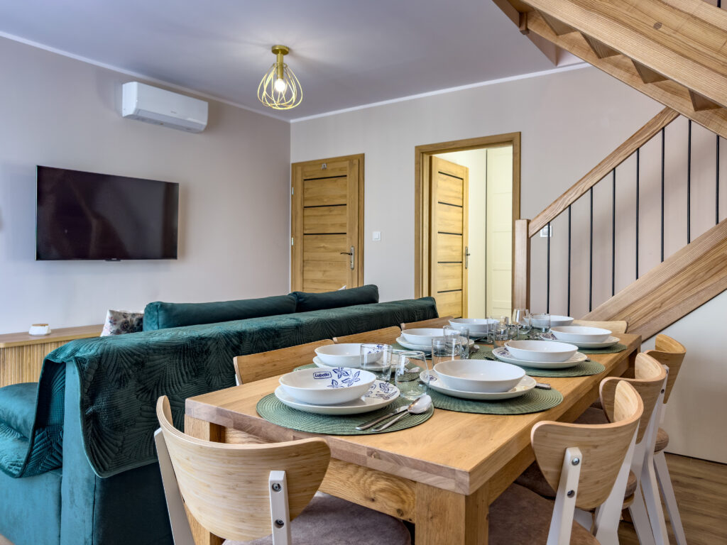 Salon zaopatrzony jest w wygodną rozkładaną sofę, TV, klimatyzację, rozkładany stół z krzesłami dla 8 osób, wyjście na taras z meblami ogrodowymi.